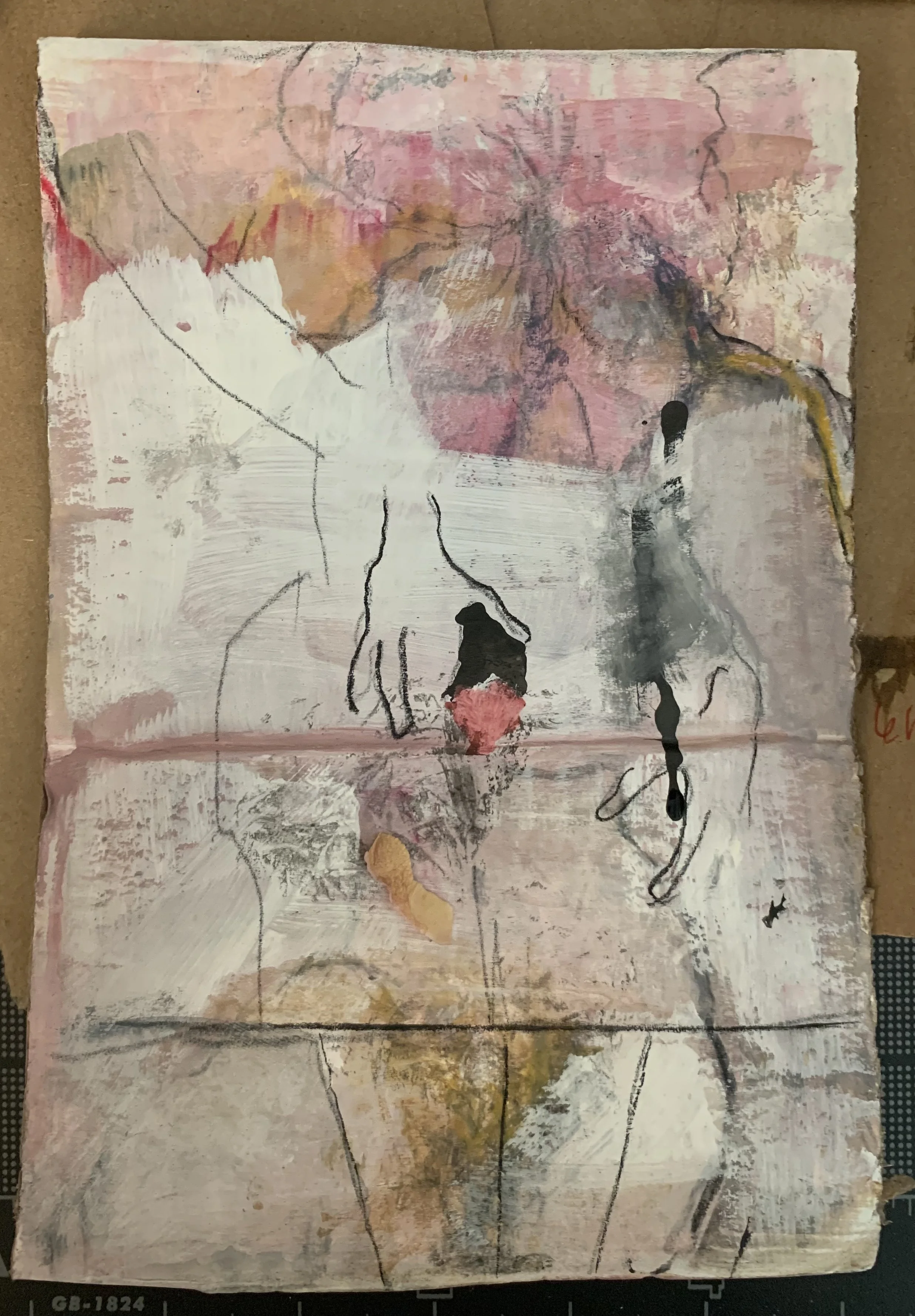 mixed media on cardboard gesso, pastel, graphite, ink, staples